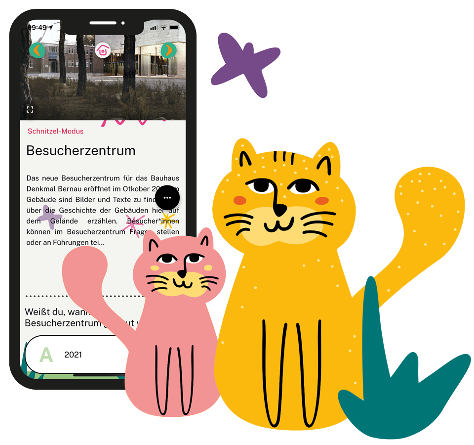 Der Schnitzel-Modus spricht besonders jüngere Zielgruppen an. Die Kater Hannes und Hans, angelehnt an die Bauhäusler Hannes Meyer und Hans Wittwer, laden Kinder und junge Erwachsene auf eine Entdeckungstour über den Campus ein.